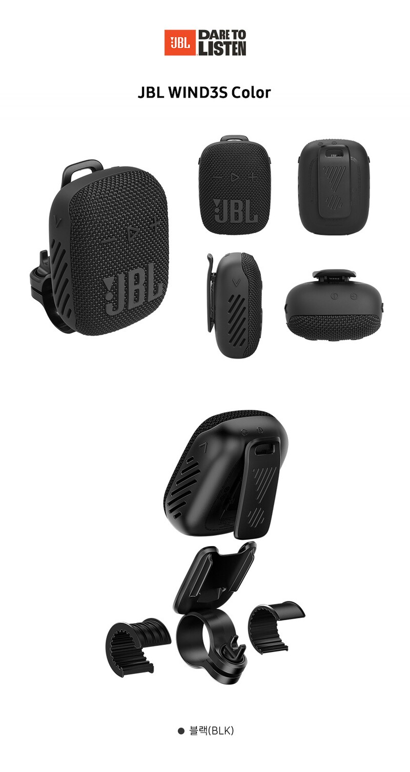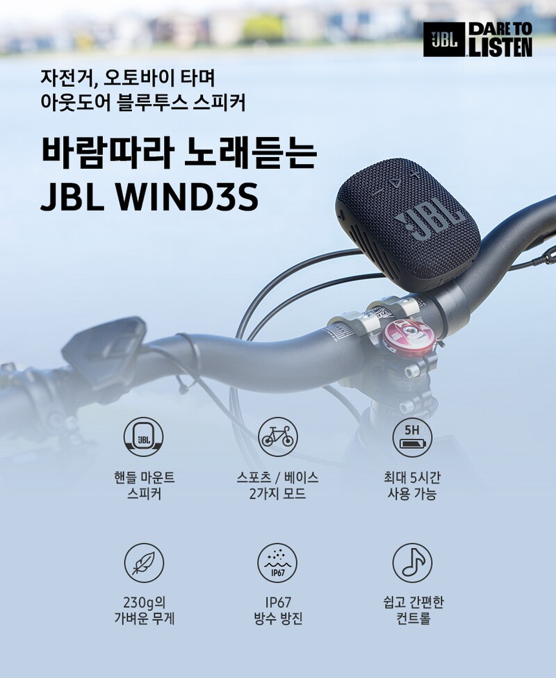 JBL WIND3S 『핸들 마운트 자전거 거치대 블루투스 스피커』안정적인 고정과 간단한 장착, 가벼운 무게에도 역동적이고 시원한 사운드 라이딩, 트레킹, 여행지 어디서나 편리하게 사용할 수 있는 무선 스피커 가벼운 무게에도 타격감 있는 고품질 사운드, 저렴한 가격에 가성비까지 갖춘 제품